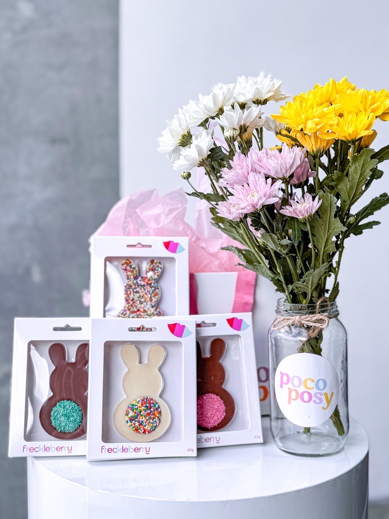A sweet and cheerful Easter gift, featuring four chocolate bunny treats paired with a fresh 3-stem chrysanthemum posy, styled in a glass pickle jar and presented in a gift bag. This ready-to-go bundle combines seasonal flowers with delicious treats—perfect for easy Easter gifting.