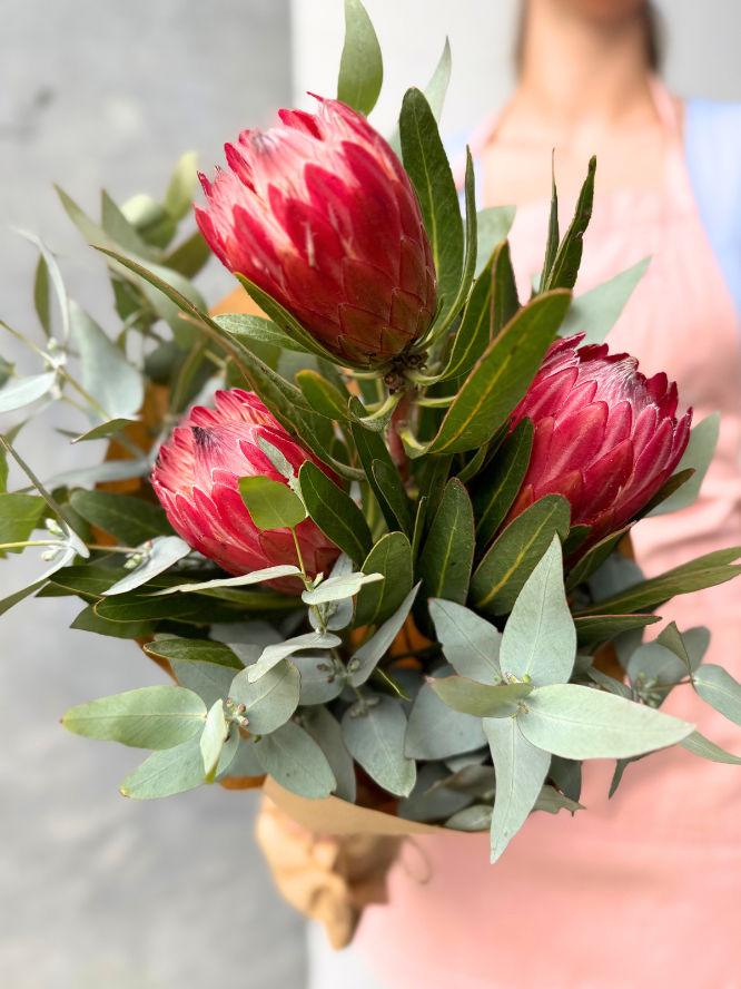 Make a statement with our bold and beautiful Protea Posy, featuring three striking protea stems paired with fresh seasonal foliages. Simply lovely!